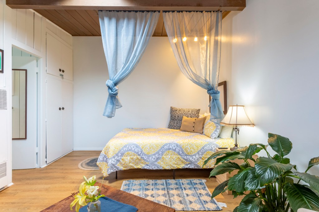 Relax in this cozy one bedroom studio with wood paneling and wooden floors throughout.